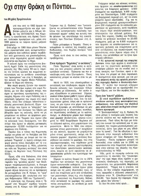 [14] Μιχάλης Τρεμόπουλος, «Όχι στη Θράκη οι Πόντιοι», περ. Οικοτοπία, Μάρτιος 1990, σελ. 12. Στη Θράκη τελικά εγκαταστάθηκαν περίπου 20.000 από το σύνολο των 250.000 που έφτασε στην Ελλάδα μέσα σε μια δεκαετία, από το 1989. Η πραγματική κατάσταση των Ποντίων που είχαν ήδη εγκατασταθεί στη Θράκη δε φαίνεται να είναι τόσο ζηλευτή. Σε προκήρυξη που εκδόθηκε τον Ιούλιο του 1988 και υπογράφεται από «Επιτροπή Ποντίων» αναφέρεται σε βιασμό μιας Πόντιας από τη ΕΣΣΔ από έναν μουσουλμάνο τονίζεται η δυσμενής κατάσταση στην οποία βρίσκονται οι Πόντιοι πρόσφυγες και σε σχέση με όλους τους υπόλοιπους. Η προκήρυξη έχει ως τίτλο «Ο αντρικός σωβινισμός είναι ο ισχυρότερος απ’ όλους τους σωβινισμούς» και έχει ως υπέρτιτλο «Η Κομοτηνή και οι πραγματικές μειονότητες». Στην προκήρυξη επισημαίνεται : «Το συγκεκριμένο και πρωτοφανές για τη Κομοτηνή γεγονός ανέδειξε και κάποιες άλλες πλευρές. Όπως: τον ρατσισμό που επικρατεί στο χώρο της μουσουλμανικής μειονότητας στην αντιμετώπιση των γυναικών…Οι Έλληνες από την ΕΣΣΔ αποτελούν την ελληνική μειονότητα της Κομοτηνής με πολλά προβλήματα.. Στην Κομοτηνή αντιμετωπίζει τον ρατσισμό πολλών άσχετων νεοελλήνων και πολλών μουσουλμάνων…. Το τελευταίο γεγονός του βιασμού απέδειξε ότι οι Έλληνες από την ΕΣΣΔ, εκτός από στόχο ανεγκέφαλων νεοελλήνων αρχίζουν να αποτελούν και πεδίο σεξιστικών ορέξεων των μουσουλμάνων».